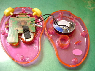 分解してみると、このような感じ。ブザーに延びている線をはずしてモーターにつなげればいいやと考えてやってみたが、全く動かず。全然ダメじゃん。駆動電圧が足りないのかなと思ってアナログテスターをつないでみると、全く針が振れない。「あれ、壊れちゃったのかな」と思い、ブザーをつなげるとちゃんとなる。そこで、デジタルテスターをつなげると、表示が0.7V・0.1V・0.9Vとふらふらする。そこでやっと気がついた。「あー、アラームの音の通りパルスの信号しか出てないんじゃん。」そりゃそうだ、モーターが動きっこないし、アナログテスターの針も動かないんだな。ダメだこりゃ。もう一度元の状態に戻して普通に使うことにする。