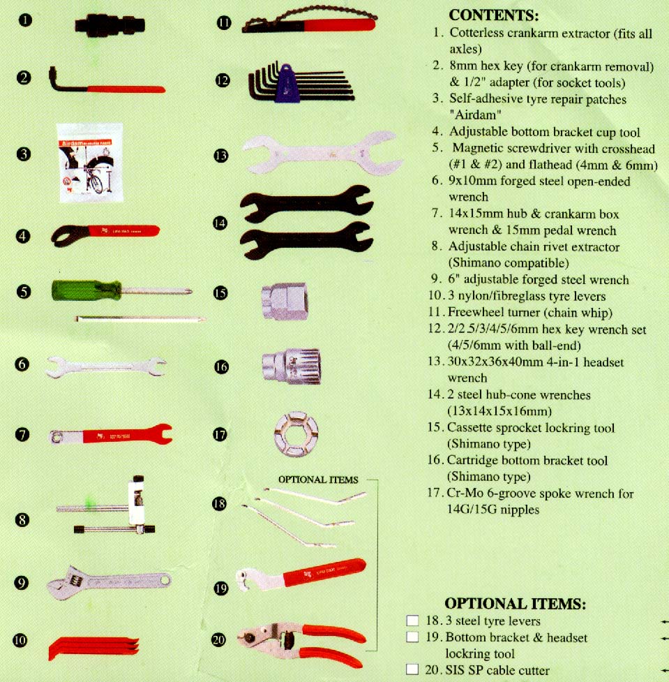 | 1 コッターレスクランク取り外し工具 | 5 ドライバー | 9 モンキーレンチ | 13 ヘッドセット用レンチ | 16 スポークレンチ |