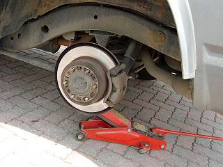 ●ジャッキアップ。自分の車は重いので、一輪ずつバネ下にかましてあげる。