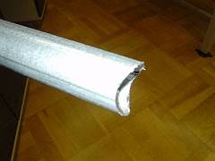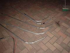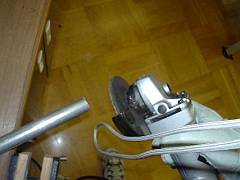 最初にパイプ(綿半ホームエイドで購入、3.3mで348円)を曲げる作業。熱しておいて熱いうちに曲げるが、金工用の万力などがないために外の壁と雨水管の間に挟み込んで曲げた。