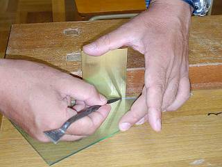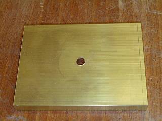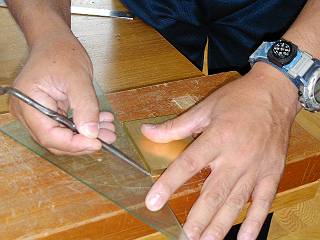 穴を開ける位置は対角線で中心にしようとしたが,けがき針の後が残るのもいやなので,両端をはかって中心を割り出した。ドリルが滑らないよう,センターポンチを打つ。