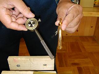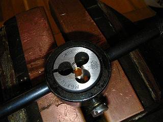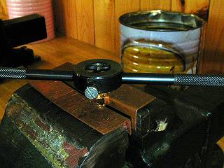 ダイスは最初に刻印面を下にして切り込む。今回の材もねじをすべてに切らなければならないので,刻印面を上にして元までねじを切る。必ず3次元で考えて直角を出すことと,180°回して少し戻してキリコを落とすことをきちんと指導したい。