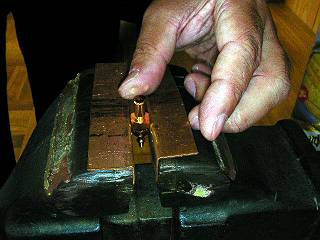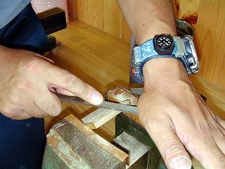 ここまで30分ちょっと。うーん,生徒がやると厳しいかな。今回自分でもやったように,ヤスリがけは金工バイス。タップ立ては木工バイスという風に分担し,場所を入れ替えながら同時進行で進めよう。ただ,木工バイスではダイスを回すための逃げスペースがないので,やはり金工バイスを使うことになりそう。