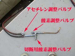 最初にアセチレン調整バルブを開いて,点火,その後酸素調整バルブで炎を調整する。