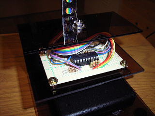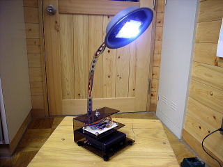 コの字型に曲げたアクリル板の中間あたりに、L字型に曲げたアクリル板をランプの首を止めるボルトで一緒にねじ留めした。