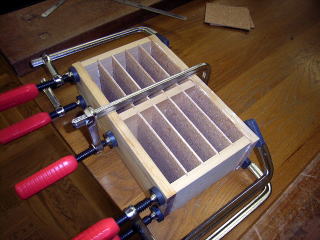 棚板は10毎重ねて加工して長さをそろえ、ボンドで接合して組み立てた。その後、裏側にもコルクベニヤを貼り付けて完成。