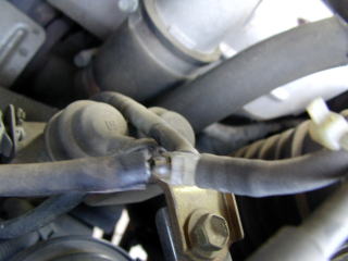 すると、エンジンからブレーキの倍力装置へ伸びるゴムチューブが分岐している部分で割れているのを発見。