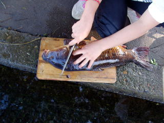 全長50cmを超えようかという大鯉。ここまで大きいと骨も多くなってしまって食べるのはたいへんらしい。