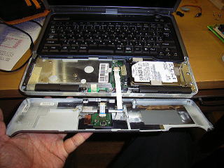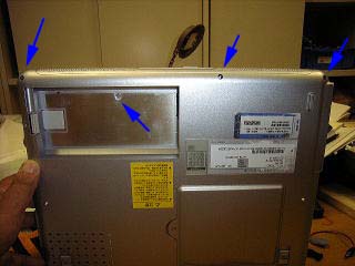 裏側の手前3つのネジをはずし、バッテリーの下のネジを1つはずす。 パームレストをはずすとすぐにHDDにアクセスできる。 3つのネジをはずして右側にずらすと、取り外すことができる。