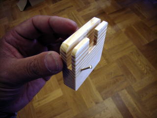 長さをそろえて、周りをヤスリがけした状態。カギを引っかけるフックを真鍮釘で作った。