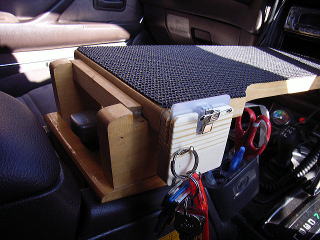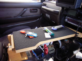 もともとのテーブルはこんな感じ。センターコンソールに板を渡して、上に滑り止めマットをひいてある。いつも車に乗ると、いろんなものをここへ置くのだが、学校で使っている名札とカギは必ずここへ置くことが定着してきていた。そこで、この2つを収納する部品を作ることにした。