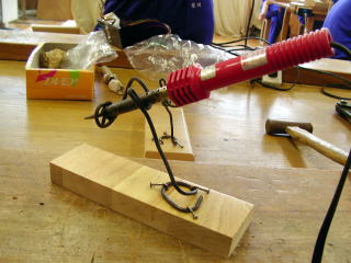 ハンダごて台は、ブリキの板を曲げて作ったものを使っているが、大勢で使うとはんだごてがずれてしまって少し危ないこともある。もう少ししっかり固定されるようなものを考えてみた。