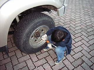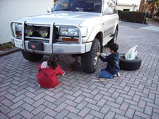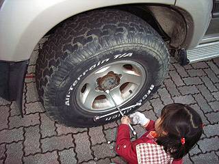 上の息子はスタッドレスのナット締め、下の娘はナットはずしを行った。