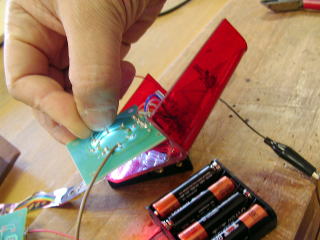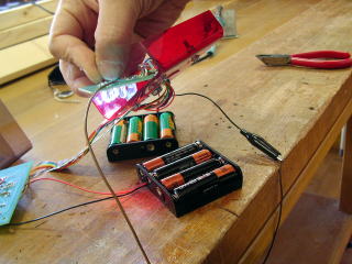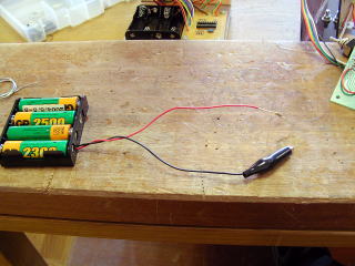 といっても、作りは簡単で、電池ボックスから出たリードの黒にはわに口クリップ、赤にはLED用の抵抗(300オーム)をハンダ付けしただけ。これで、LEDが実際に光かどうかをチェックする。