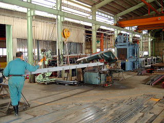 表面をならしてからローラーをかけようと言うことになり、最初はトンボを車でひこうかという話をしていたが、やはり重い鉄骨でもひかなきゃだめだろうということになり、知り合いの鉄工所へおじゃましてH鋼を切ってもらってきた。