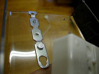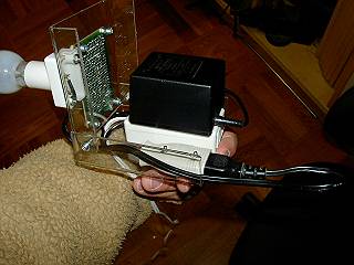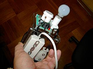 センサーの隣にランプを付け、下の部分をネジで留めて一緒に角度を調整できるようにした。ランプは直接接続せず、プラグを介してリレーからの出力につなぐ。必要に応じて他の電気機器をつなぐことができるようにした。このリレーは200wまで使えるので、3つ口コンセントなどを入れてもいいかな。
