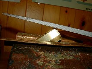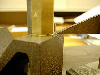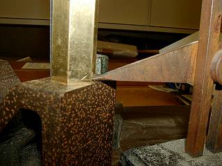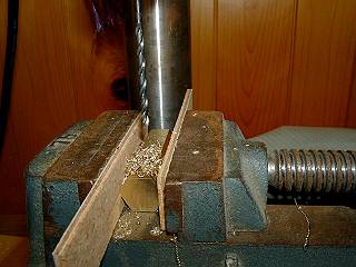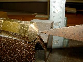 上部の面取り。平らに削ることができるよう材料を斜めにして固定する。