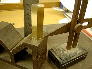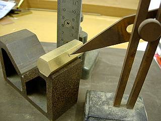 上面は1mmの面取りを行うので、Vブロックの上面から1mmにトースカンの先をあわせて、端面と側面にけがき。