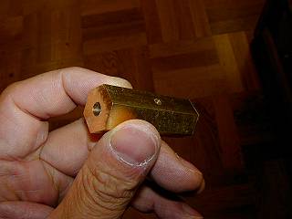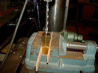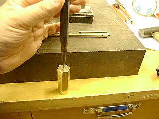 六角柱の穴あけ、こちらは留め穴なので、ゲージを頼りに穴を開ける。