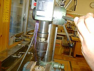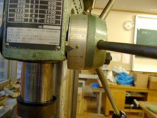 台座の穴あけ。抜ける瞬間が一番危ないので、厚さの10mmにあわせて深さゲージを読んで備える。