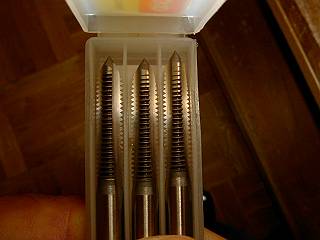 ねじ切り。六角柱の方は留め穴なので、3本のタップを順に使って切る。