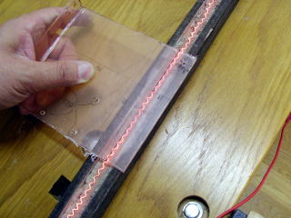 今回ペット材を曲げようとしたら、アクリル曲げ器のニクロム線が外れて伸びきっていた。