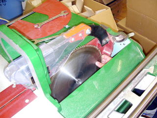 チップソーを取り替える。いい加減切れなくなってしまったので、新しいものに取り替えた。 うちの丸のこ盤はのこ刃の反対側に軸のストッパーが装備されていた。