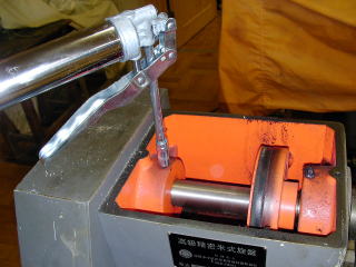 旋盤のグリスアップ。先日購入したグリスガンで注入する。