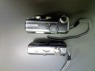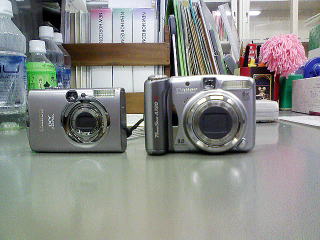 まずは、2つを並べたところ(写真は携帯電話で撮影)。当然IXYの方がかなりコンパクト。