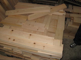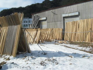 ヒノキ材がずらりと並んでいる。切れ端を積み上げた高さで売ってもらうこともできるとのこと。