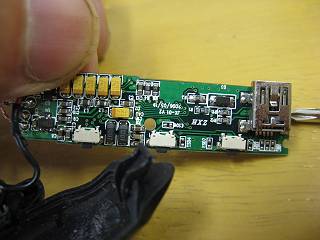 右側に基盤が入っている。一番右にUSBコネクタ。 左側はバッテリー。 ちょっと接続コードにひげが出ていて、ショートしているっぽかったので、それをほどいて組み立てたら復活した。 ついでに、隙間テープを貼って鼻で留まるようにしてみた。