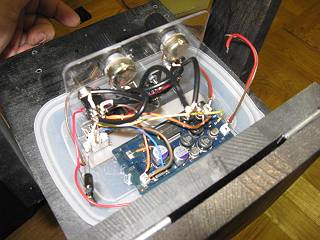 奥に実装されているのが今回購入したデジタルアンプ。こんなに小さいのに10wの出力。