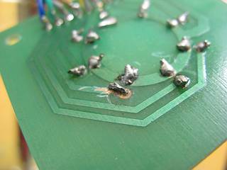 これは、ランドがはがれていたところにハンダ付けしようとしてついていなかったもの。少し前の部分の塗装をはがしてハンダ付けしたら大丈夫だった。