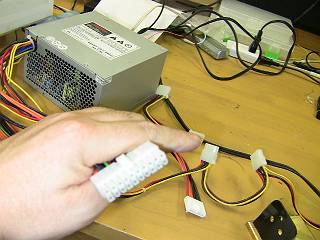 まずは、余っているデスクトップ用の電源を使う方法。マザーボードへ挿すコネクタの13番と14番をショートさせると電源が入る。