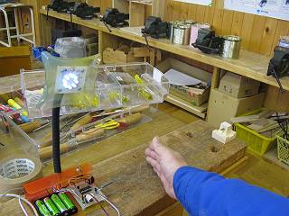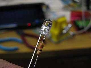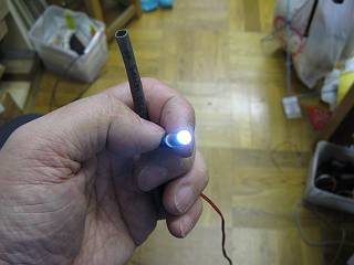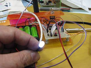 遮光センサーとしてのCDSを照らすための光として、ここへ白色LEDをつないで試してみた。