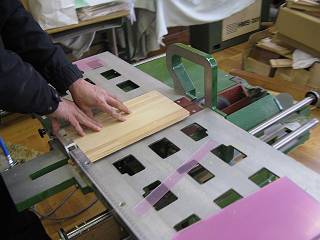 こちらは治具(枠)。ここに材料を5枚くらい入れて一気に穴を開けてしまうようにした。
