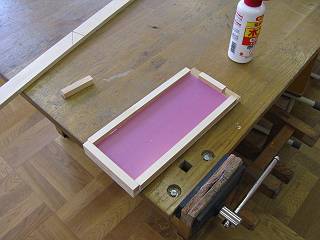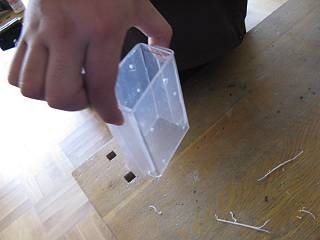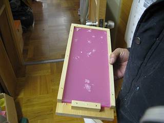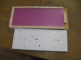 枠の上にPET材を載せ、上に穴位置をあけた木の板を載せる。