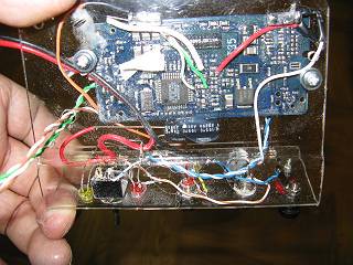 ペット材を曲げてすべてを固定する。左側にバッテリーから来たDC12Vを取り出す端子。