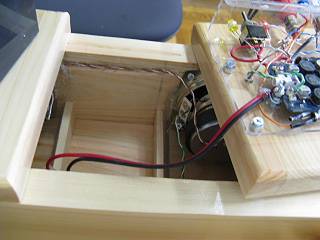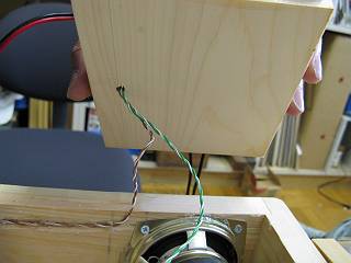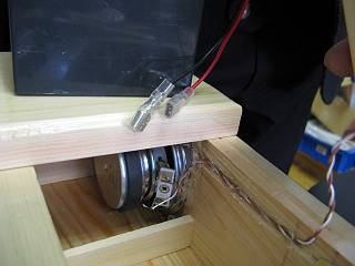 アンプ&スイッチユニットを左側に木ねじで固定し、スピーカーコードを引っ張る。