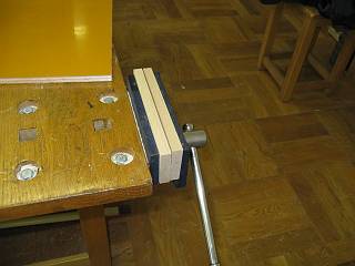 今回は檜材を使って作ってみた。6台のテーブルで12個の万力がリニューアルできた。