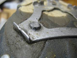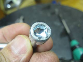 これが、すり減ったスパイクピン。本来のボルトを外すための工具は力に負けてえぐれてしまっていた。