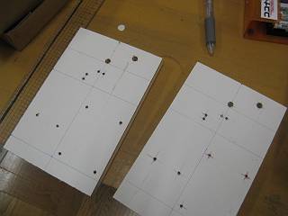 12mm厚の板に白い化粧合板を貼り付けて、穴あけ位置にあける。
