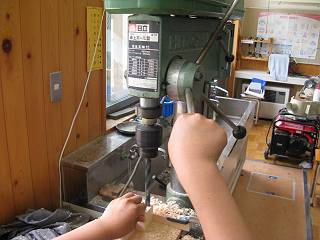 ペン立て部分は早く終わった生徒にボール盤どんどん穴あけをしてもらう。こちらは12mmのドリル。