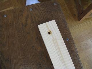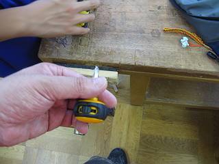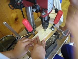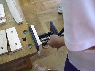穴あけは2段ギリで開ける。先日の木工授業で使った治具を使って位置決めをした。