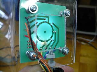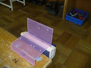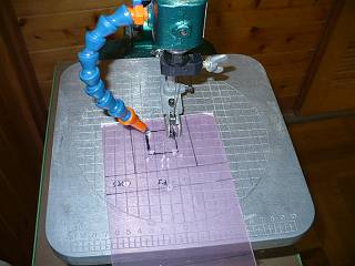ビスナットなどの穴あけの他に、ランプシェードの裏側を糸鋸でくりぬいて、取り付けた状態でもLEDを交換できるようにした。