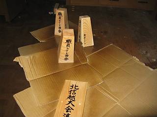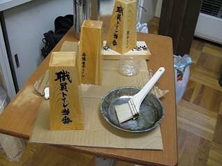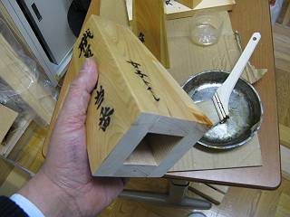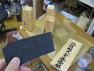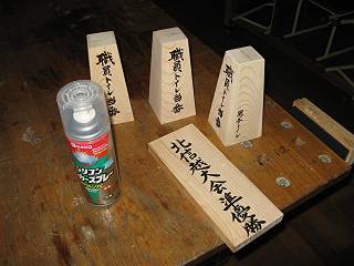 教頭先生に文字を書いてもらって、塗装に移る。墨がにじんでしまうかどうかを確かめるために、同じ材料で試し書きをしてもらう。