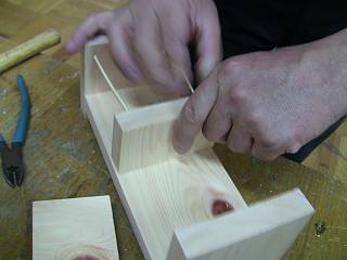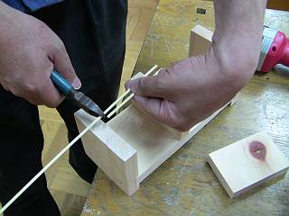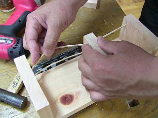 作り終えてから、もう片方も竹籤をいれるのがよいということで、ドリルで脇から穴を開け、たゆまして竹籤を差し込む。