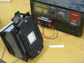 ペルチェとクーラーをくっつけて電源につないでみる。11Vで5A流れて、この電源ではめいっぱいの状態。
