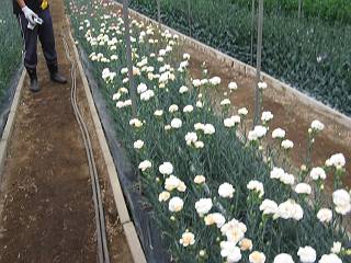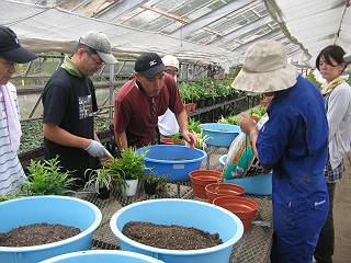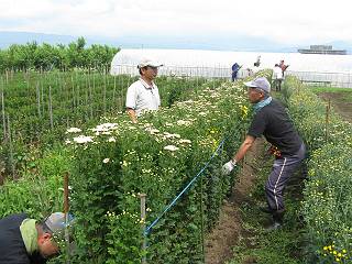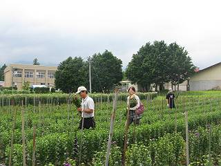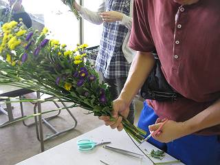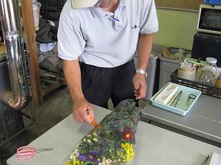 最初はお盆に販売するために作っている切り花を切って,花束を作る講習。