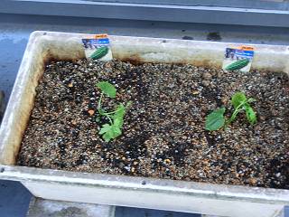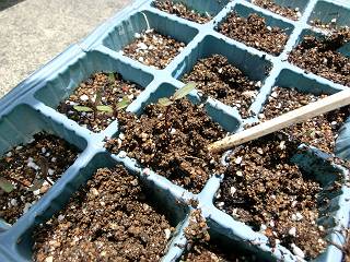 そこへ、苗を移植する。本葉が出てからかなと思っていたのだけれど、物の本には双葉のうちにというのもあった。
